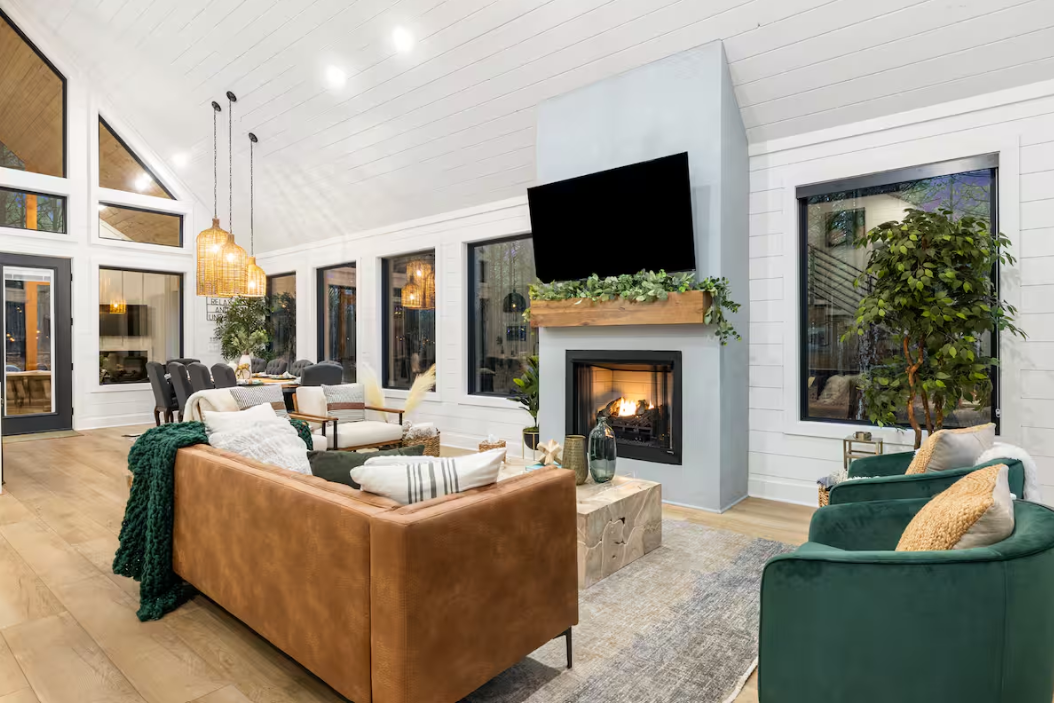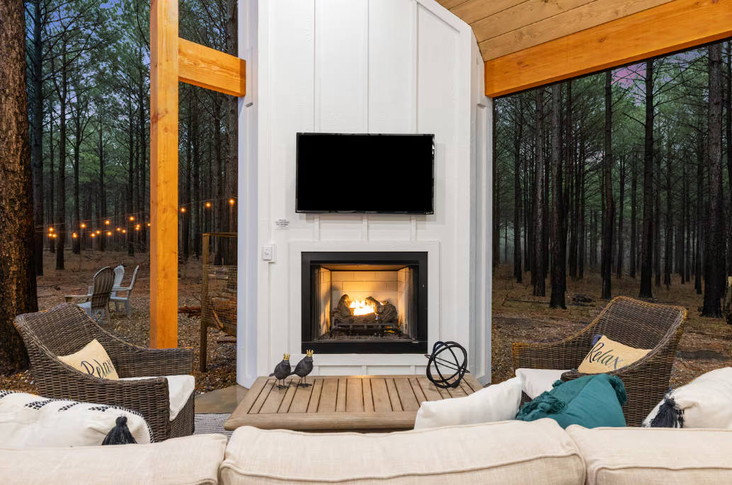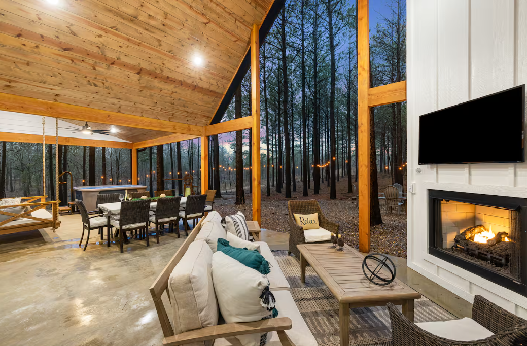 🌲 Covered Deck: Unwind on the spacious covered deck, featuring a smart TV, plush furniture, a gas fireplace, and a rejuvenating hot tub for moments of pure bliss.