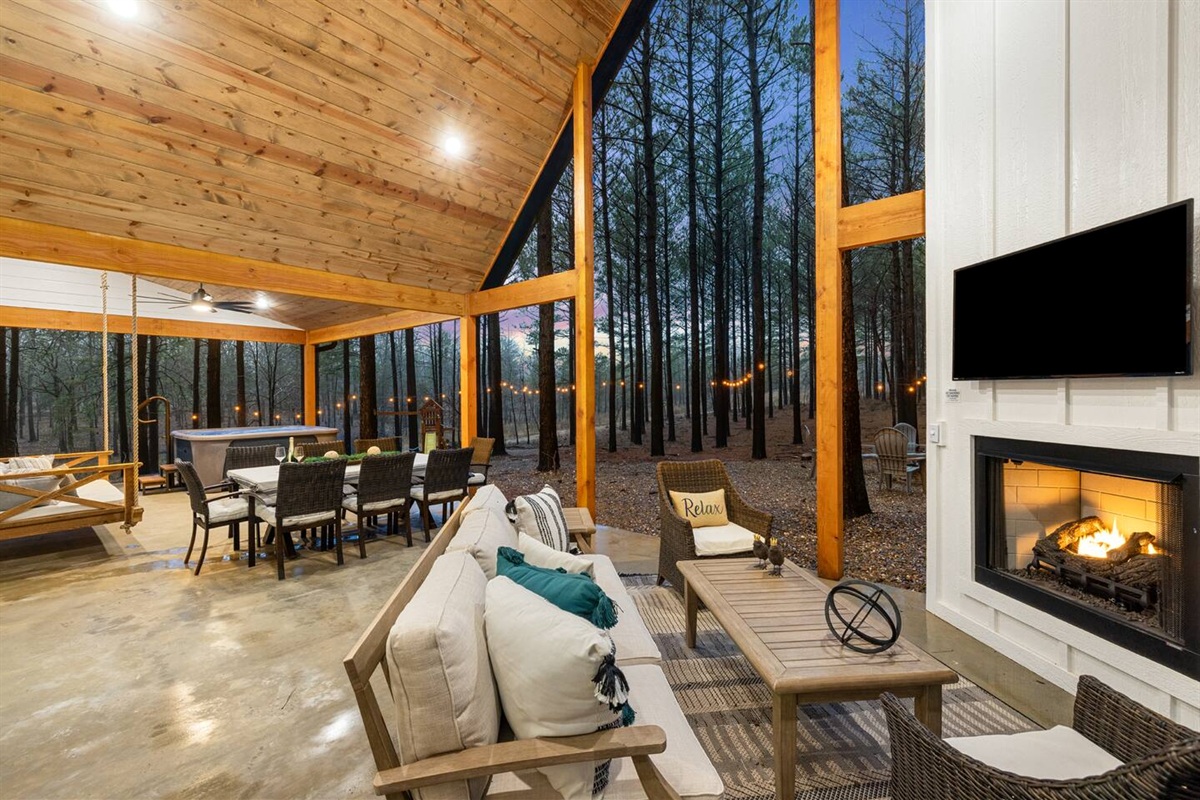The main living area is designed for gathering. Warm wood finishes, comfortable seating, and an indoor fireplace create a welcoming space after a day exploring Hochatown.