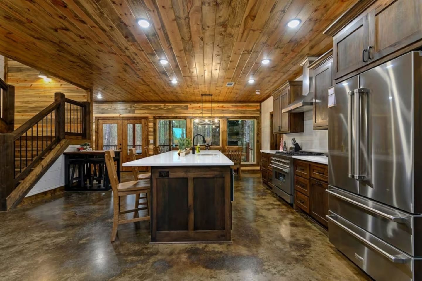 👨👩👧👦 With space for up to 24 guests, this 5-bedroom retreat blends rustic charm with upscale finishes.