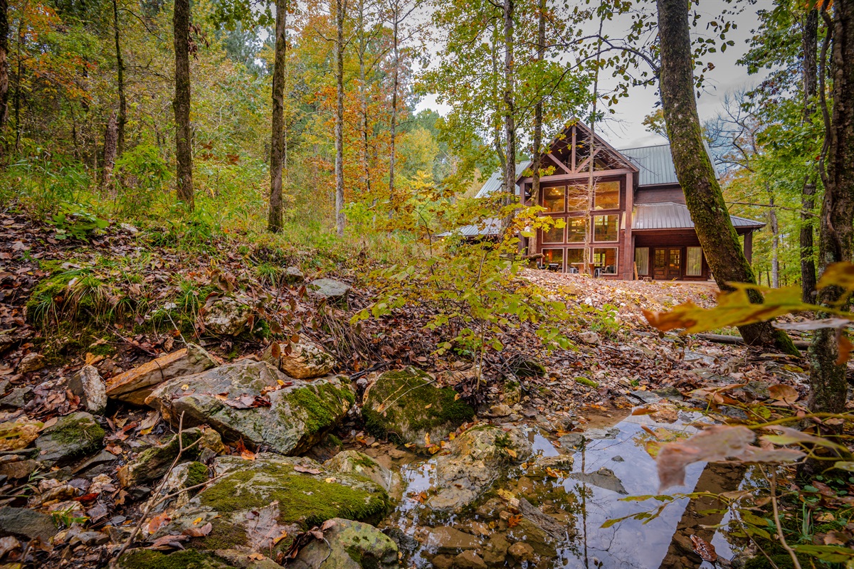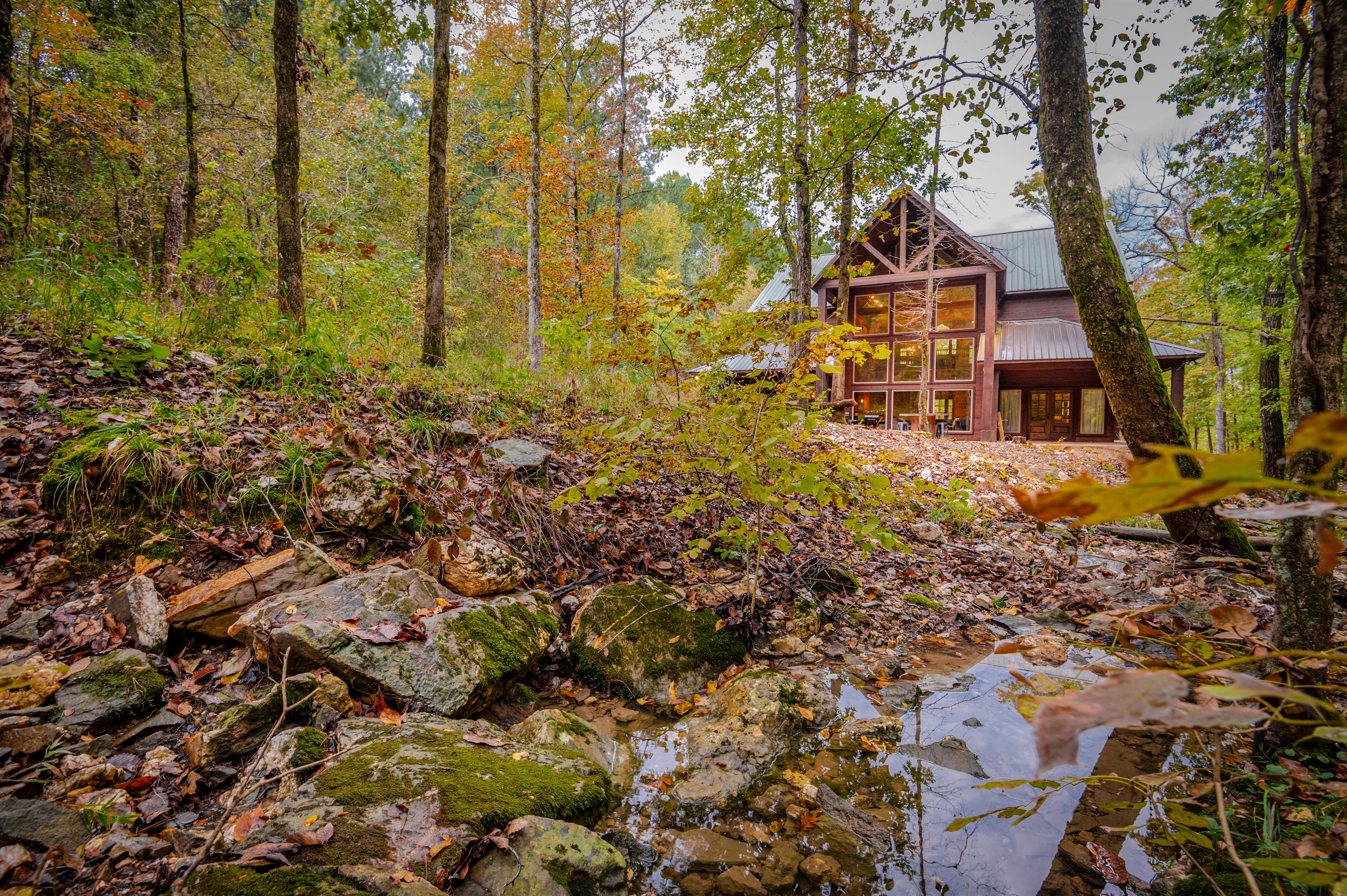 Stunning exterior shot of the cabin surrounded by lush trees, featuring a charming wooden bridge leading to the entrance.