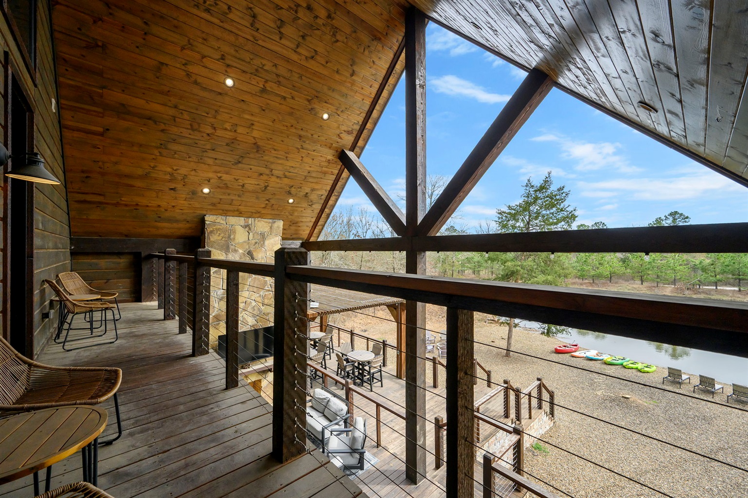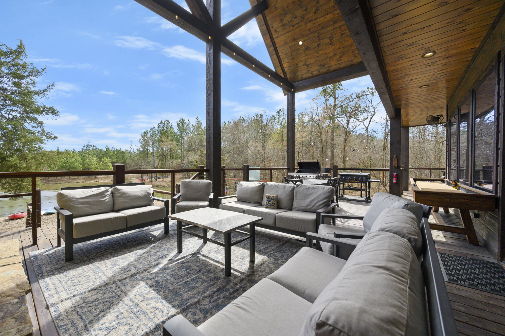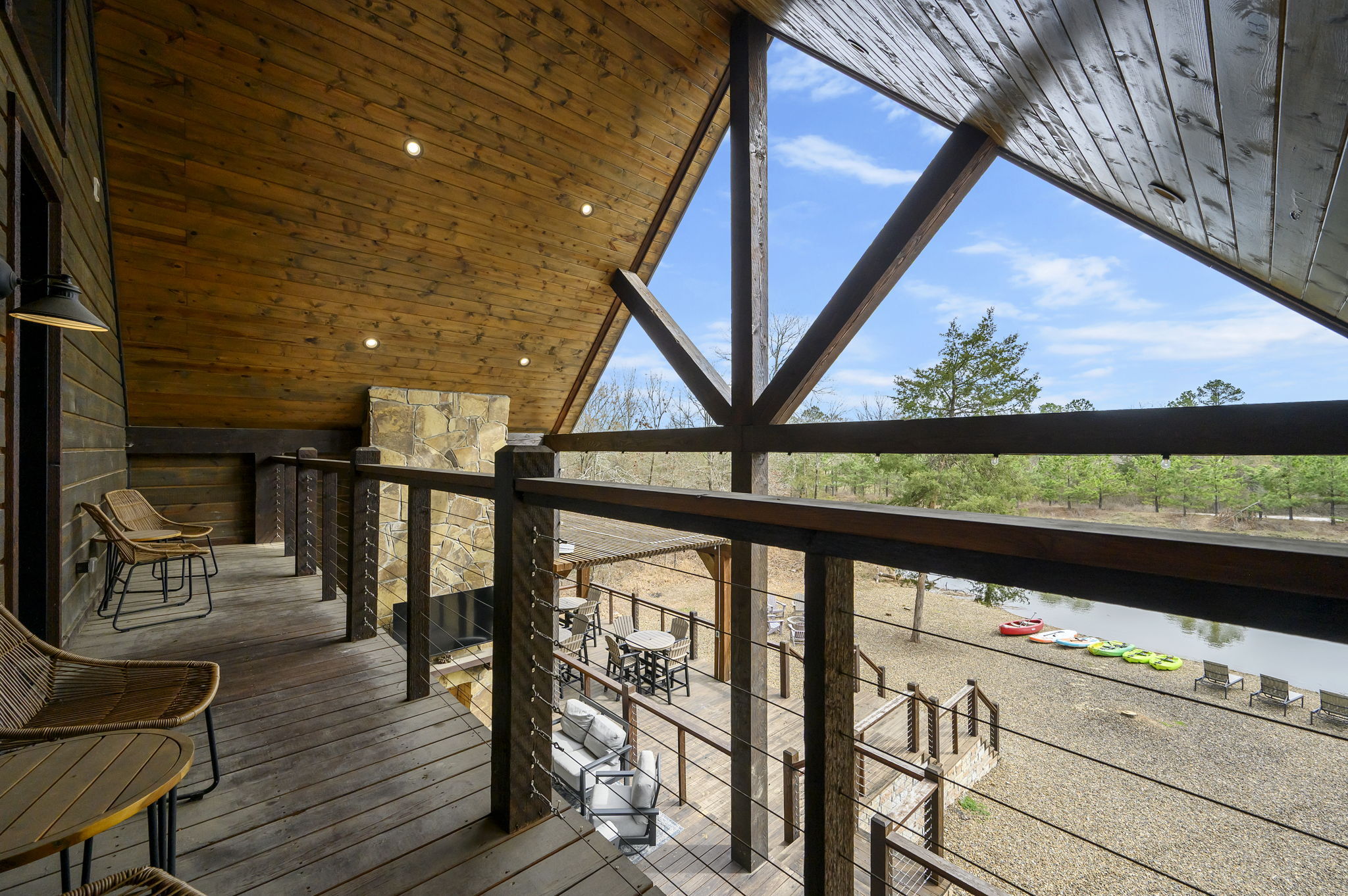 5 Bedrooms • 6 Bathrooms (5 full, 1 half) 6 Baths (5 full, 1 half) • Sleeps 10-18The moment you walk into Skippin’ Rocks by The Weekender Stays, the view stops you in your tracks—towering windows frame a peaceful private pond, sunlight pours in, and the sound of laughter drifts from the game room downstairs. Every space was designed for connection—morning coffee by the water, dinner on the deck, fireside talks that last late into the night. From the moment you arrive, the wraparound deck and wall of windows draw you straight to the water. Mornings start with coffee overlooking the pond, days are spent kayaking or fishing, and nights end in the hot tub, by the fire, or competing in the game room.