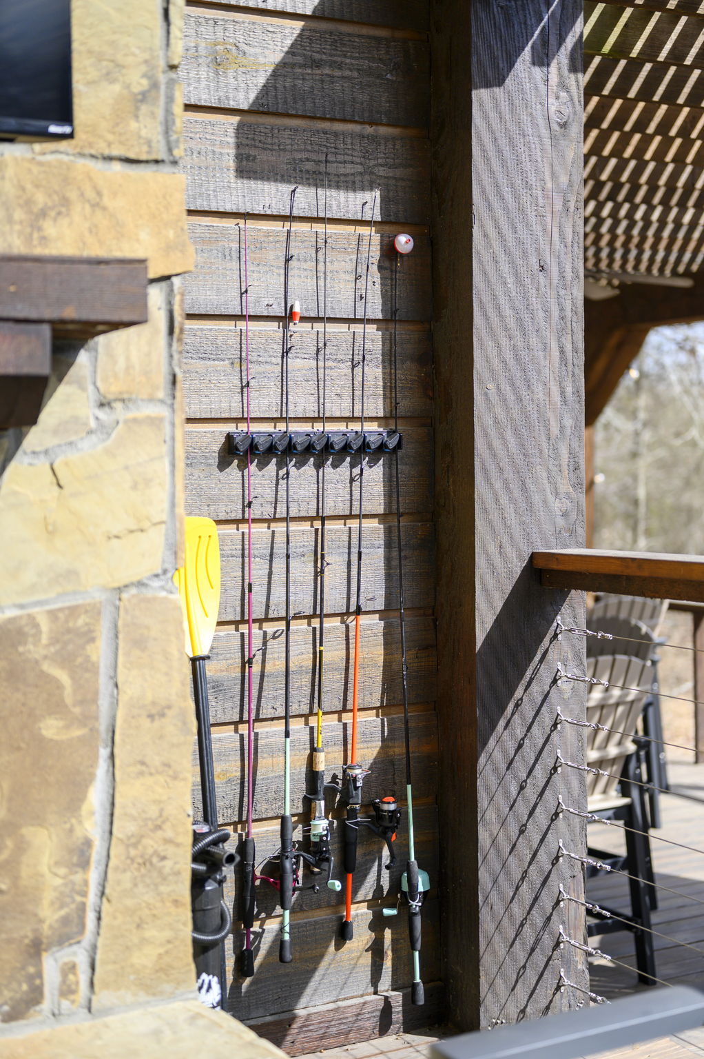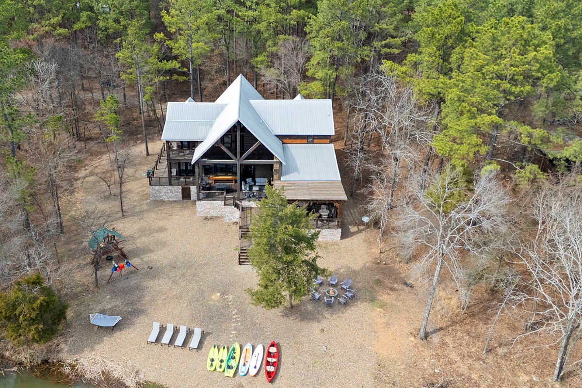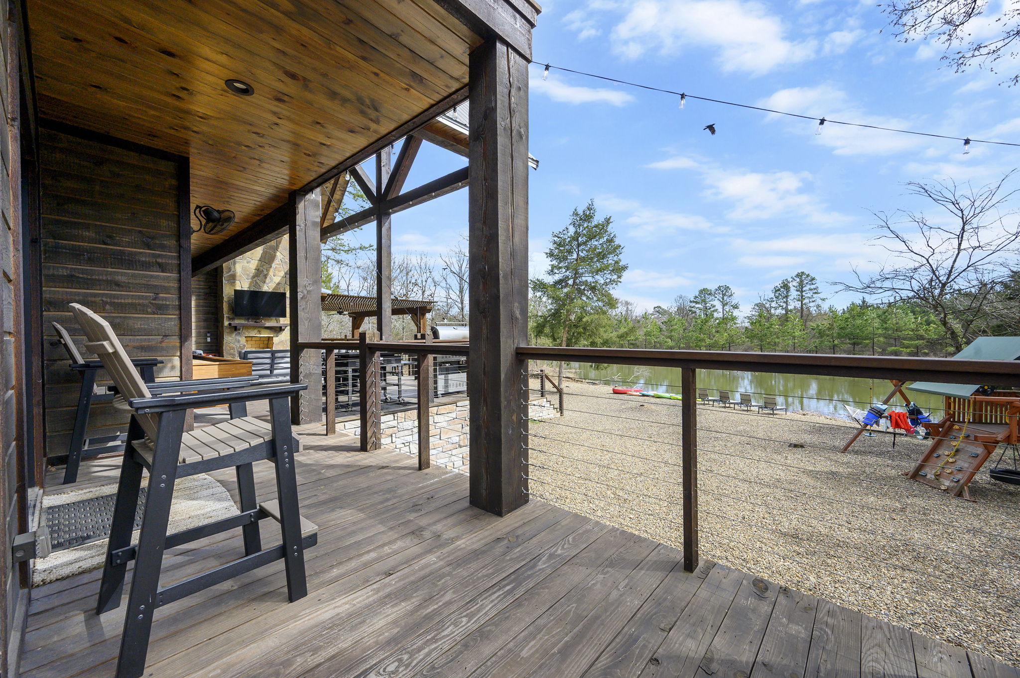 5 Bedrooms • 6 Bathrooms (5 full, 1 half) 6 Baths (5 full, 1 half) • Sleeps 10-18The moment you walk into Skippin’ Rocks by The Weekender Stays, the view stops you in your tracks—towering windows frame a peaceful private pond, sunlight pours in, and the sound of laughter drifts from the game room downstairs. Every space was designed for connection—morning coffee by the water, dinner on the deck, fireside talks that last late into the night. From the moment you arrive, the wraparound deck and wall of windows draw you straight to the water. Mornings start with coffee overlooking the pond, days are spent kayaking or fishing, and nights end in the hot tub, by the fire, or competing in the game room.