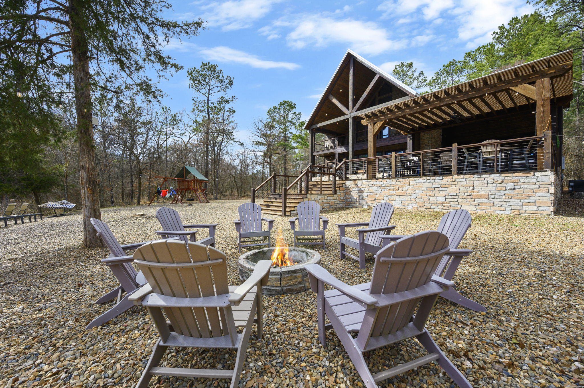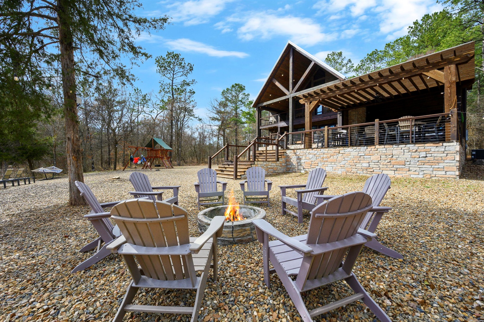 ☞ Two outdoor fireplaces + wood-burning fire pit with Adirondack chairs for unforgettable nights.