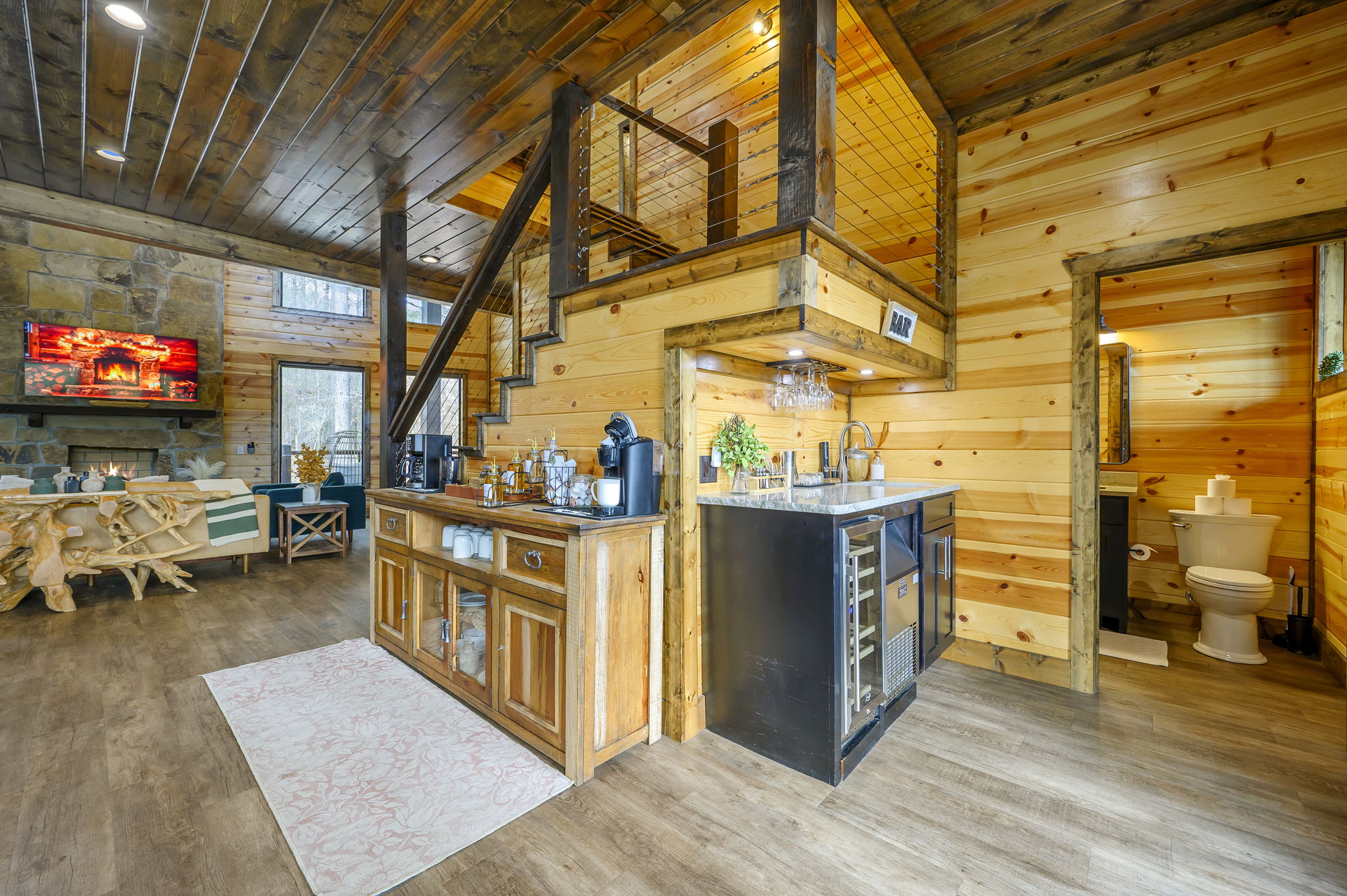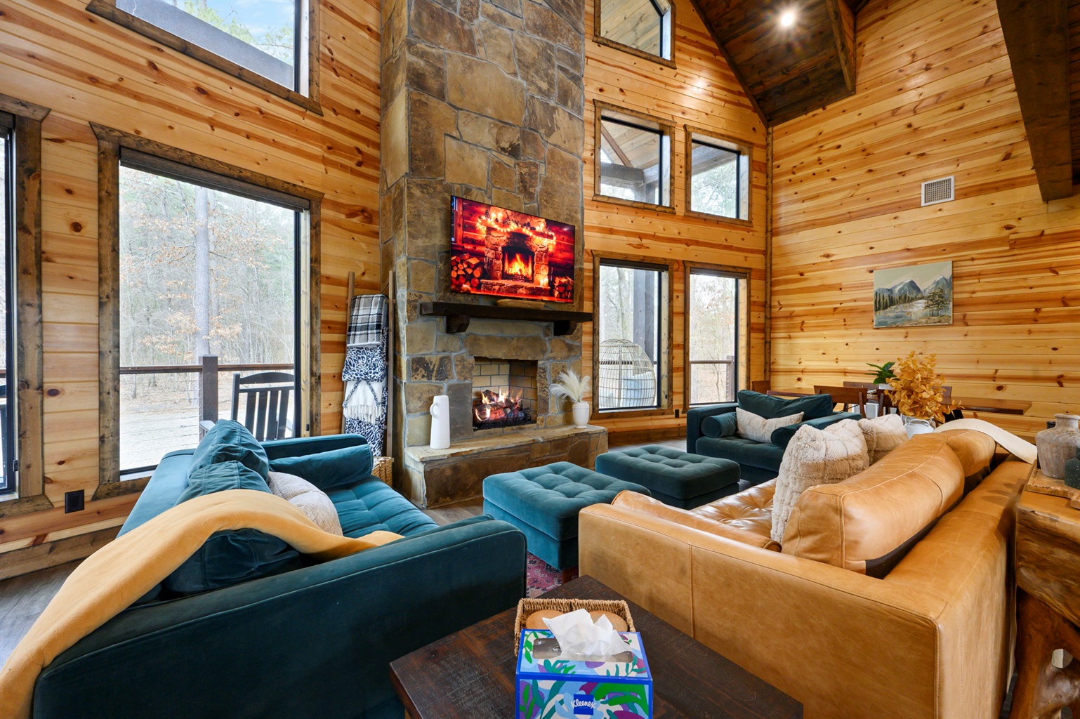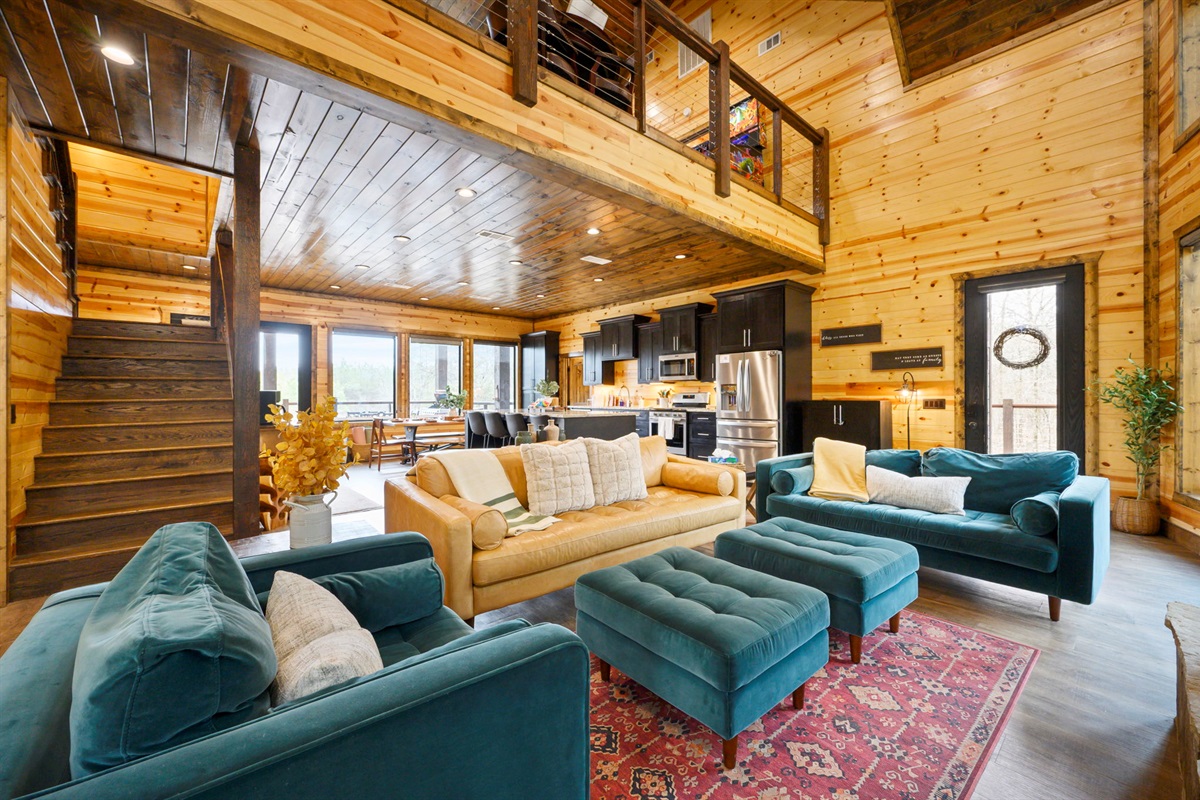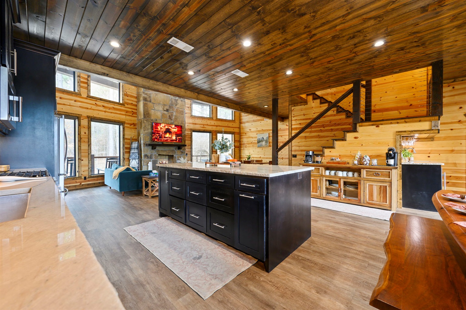 ☞ Vaulted ceilings, natural stone, and warm wood tones create the perfect place to gather.