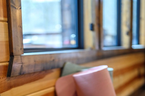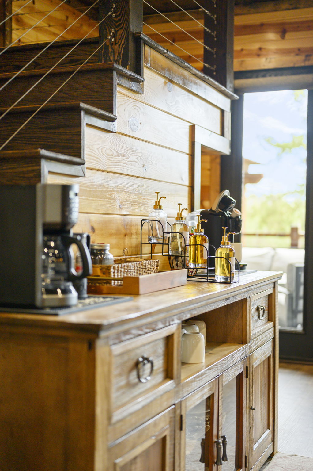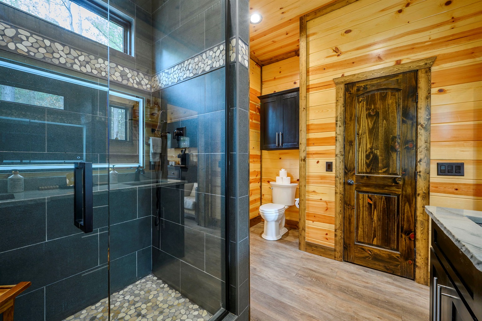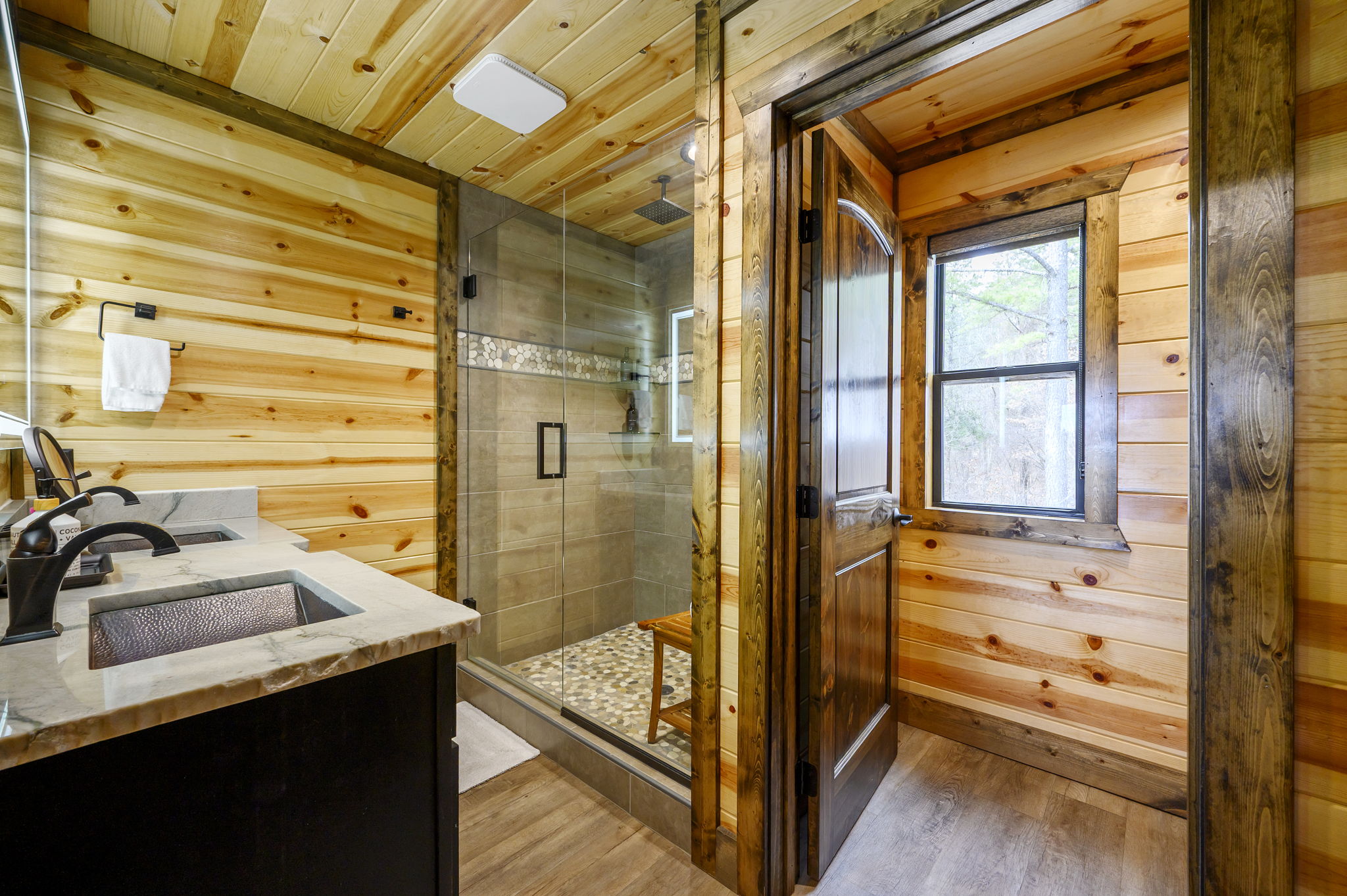 ☞ Vaulted ceilings, natural stone, and warm wood tones create the perfect place to gather.