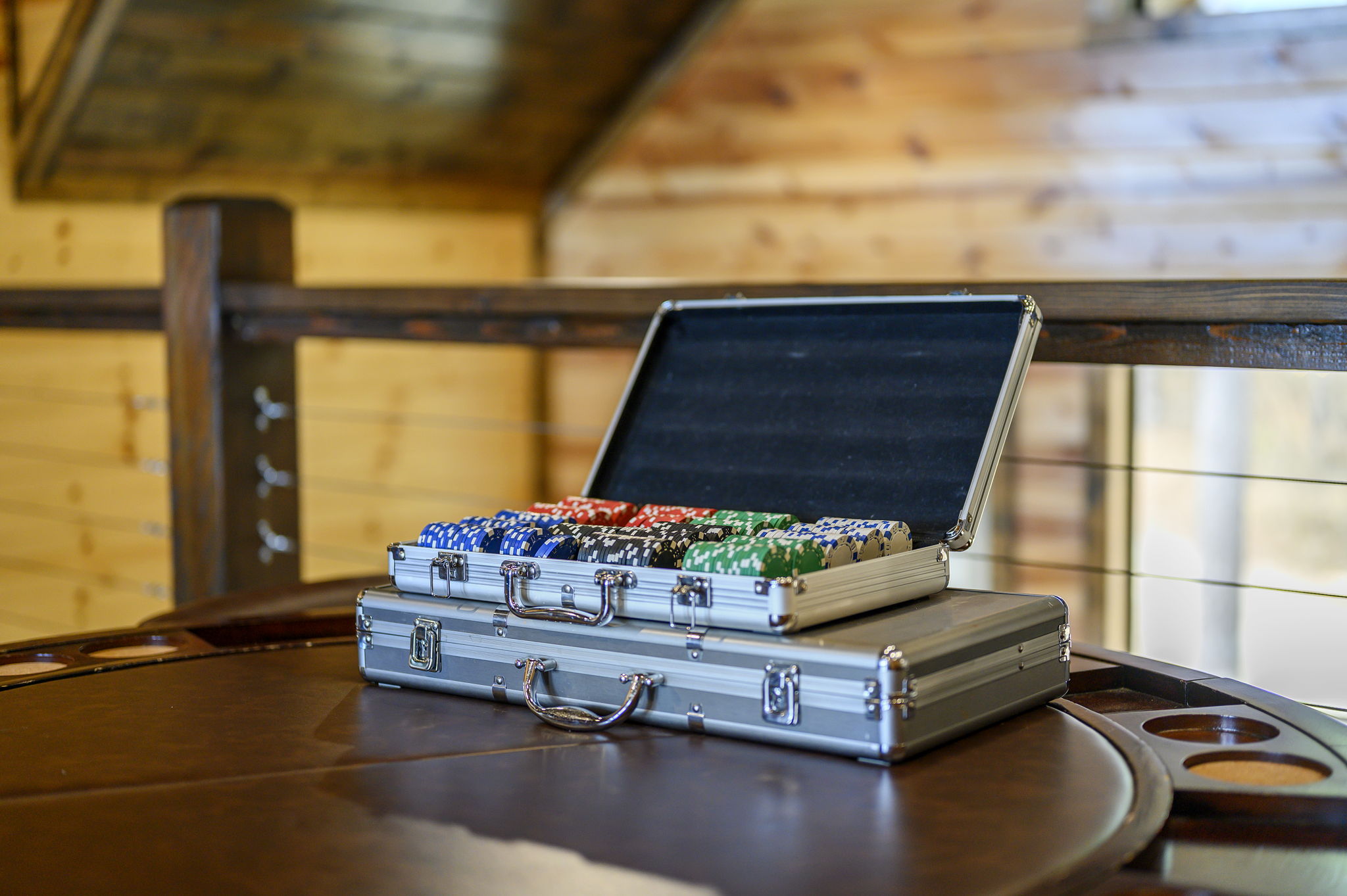 ☞ Poker + multi-use game table for friendly competition.